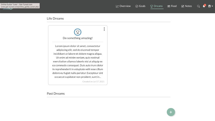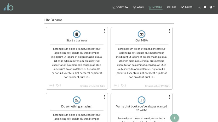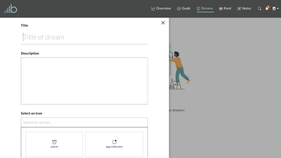 First, fill in the title of the dream. Next, fill in a good description of what it is you’d like to accomplish as well as how you’d like to make it happen. After that, you’ll need to assign an icon to the dream as a visual indicator of what that dream is all about. Finally, you can add tags to the dream which will add a visualization of how many tasks you’ve completed that relate to each tag you’ve added. Then click “Create dream” to finish creating the dream. After you have done that the dream will appear below at the top (if it’s the first dream you’ve created) or at the bottom of all the previous dreams you’ve created.