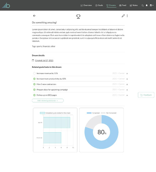 If you’re currently a premium subscriber you’ll also be able to add related goals/tasks to the dream. To do this click the “Add related goals/tasks ” button. A search input box will appear where you can then search for goals/tasks you’ve created. Then you can add those goals/tasks to the dream by clicking the task in the search dropdown. You’ll notice that as you add related goals/tasks a circle graph will appear showing the percentage of goals/tasks you’ve completed that relate to that dream.