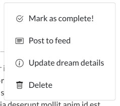 Always keep in mind that with most things you do in the brightyear.io app, you’ll have the ability to share that thing on your social feed, letting all of your connections know about what you’ve completed. Share whatever the current status of the dream is by clicking the “Post to Feed” option in the dropdown. You can also write a post description letting others know more about that dream you’ve created and/or completed.