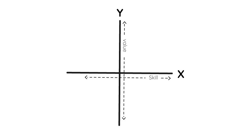 During the lecture, this business leader drew two intersecting horizontal and vertical lines which made up four equal quadrants. The lecturer described to us that the horizontal line, or x-axis, represented one’s skill level, and the vertical line, or y-axis, represented what you value, or have an interest in. He explained that these lines represented spectrums and further up you went on the y-axis, for example, that meant the more you valued a particular field. Reversely the more you went down the y-axis, the more disinterested you were. As you would then guess, the horizontal, or x-axis, represented the level of skill you had with a particular field. The more to the right you went the more skilled you were and the more left the more unskilled. This graph is depicted below: